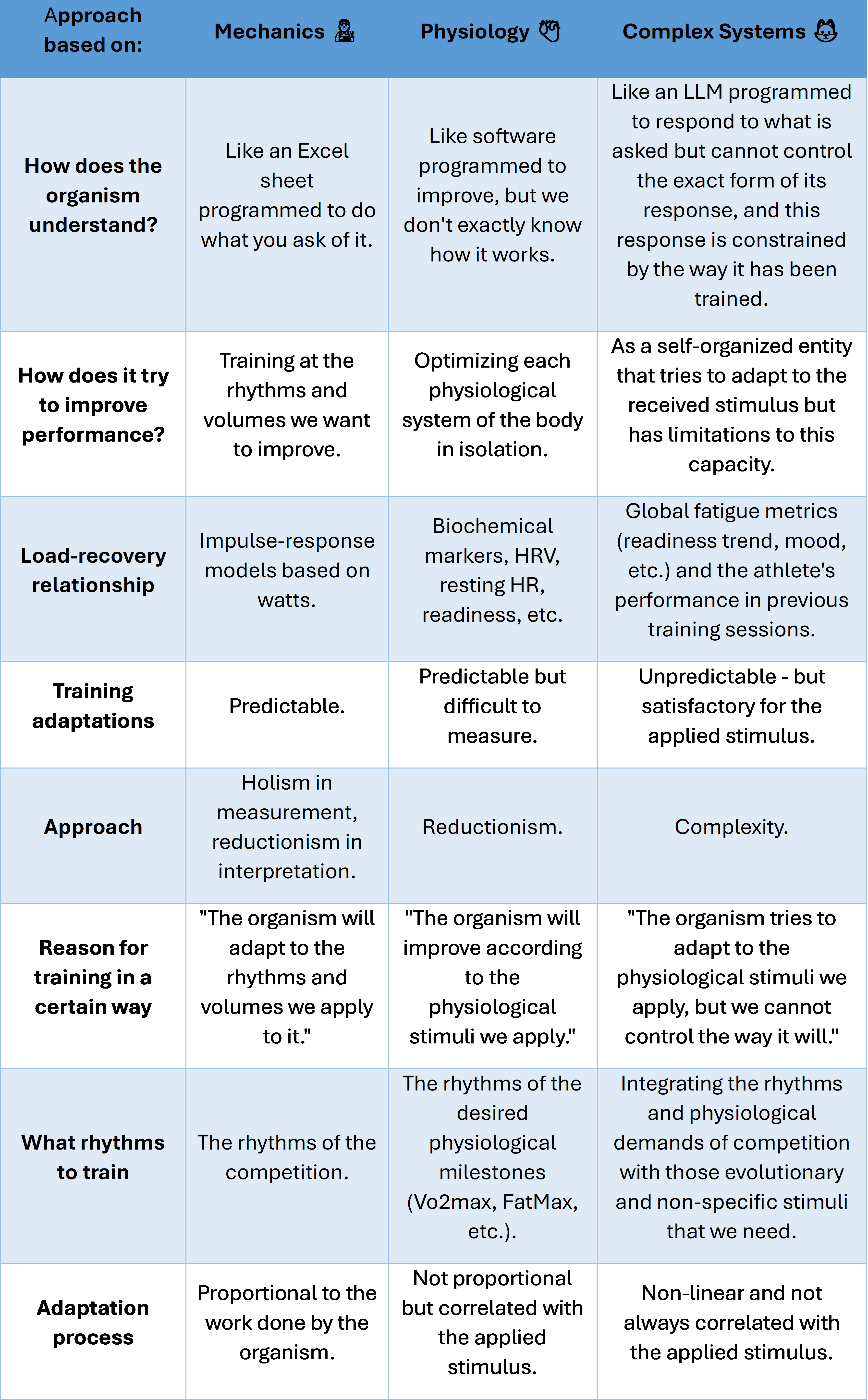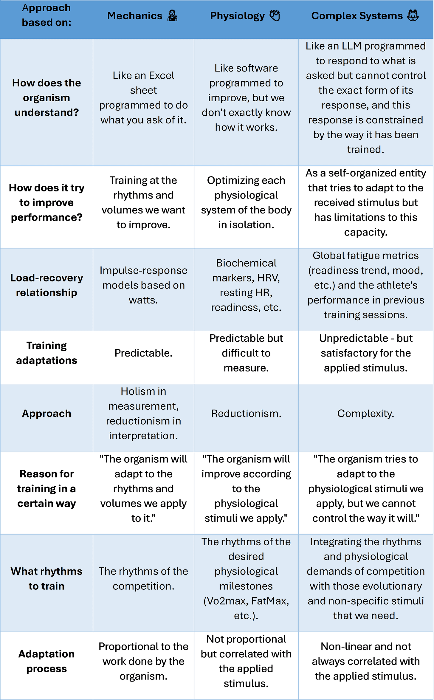 The mechanical approach proposes trying to replicate the efforts and volumes the athlete must perform in competition with the idea that the organism will improve specifically guided towards replicating the watts they produce in training, and that by simulating the competition demands (in watts), we will be better prepared for it.